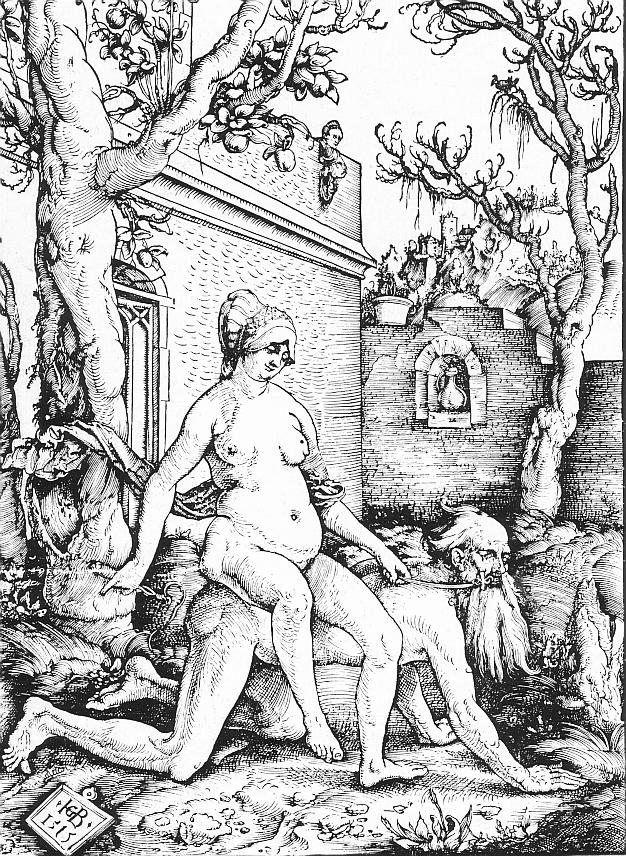 By 1503 Baldung had moved to Nuremberg and had become a member of Albrecht Dürer's workshop. It was probably here that he acquired the nickname "Grien", perhaps a reference to his use of the color green or a preference for green attire -- he has a marked affinity for the color green, and many of his religious scenes are bathed in a weird, supernatural glow. It could also have distinguished him from Hans Schäufelein, Hans Süss von Kulmbach, and Hans Dürer, Albrecht's younger brother, all of whom were in Dürer's atelier. Baldung immediately absorbed Dürer's formal vocabulary, as is evident in one of his earliest dated works, the 1503 pen drawing of Aristotle and Phyllis. This picture symbolizes the power of the women by representing the phylosopher Aristotle as he brings on his back his lover, Phyllis. This story was often pictured by Renaissance artists.