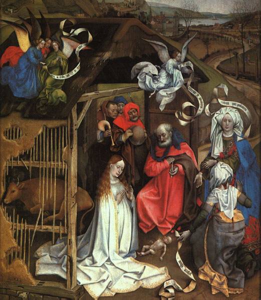 While there is still doubt about the Master of Flémalle's identity, there is no argument about his achievement, for he made a radical break with the elegant International Gothic style and ranks with van Eyck as one of the founders of the Netherlandish school of painting. None of the paintings given to him is dated -- with the exception of the wings of the Werl altarpiece of 1438 in the Prado, a doubtful attribution -- but it seems likely that his earliest works antedate any surviving picture by van Eyck. The earliest of all is generally thought to be The Entombment (Courtauld Institute, London) of about 1410/20. This still has the decorative gold background of medieval tradition, but the influence of Claus Sluter is clear in the sculptural solidity and dramatic force of the figures. The most famous work associated with the Master of Flémalle is the Mérode Altarpiece (Metropolitan Museum, New York), and he is indeed sometimes referred to as the Master of Mérode. However, the attribution of this painting has also been questioned. Among the other works generally accepted as his are The Marriage of the Virgin (Prado, Madrid), The Nativity (Musee des Beaux-Arts, Dijon), and The Virgin and Child before a Firescreen (National Gallery, London), which shows the homely detail and down-to-earth naturalism associated with the artist (the firescreen behind the Virgin's head forms a substitute for a halo). The National Gallery also has three portraits associated with the Master of Flémalle. In spite of the many problems that still surround him, he emerges as a very powerful and important artistic personality.